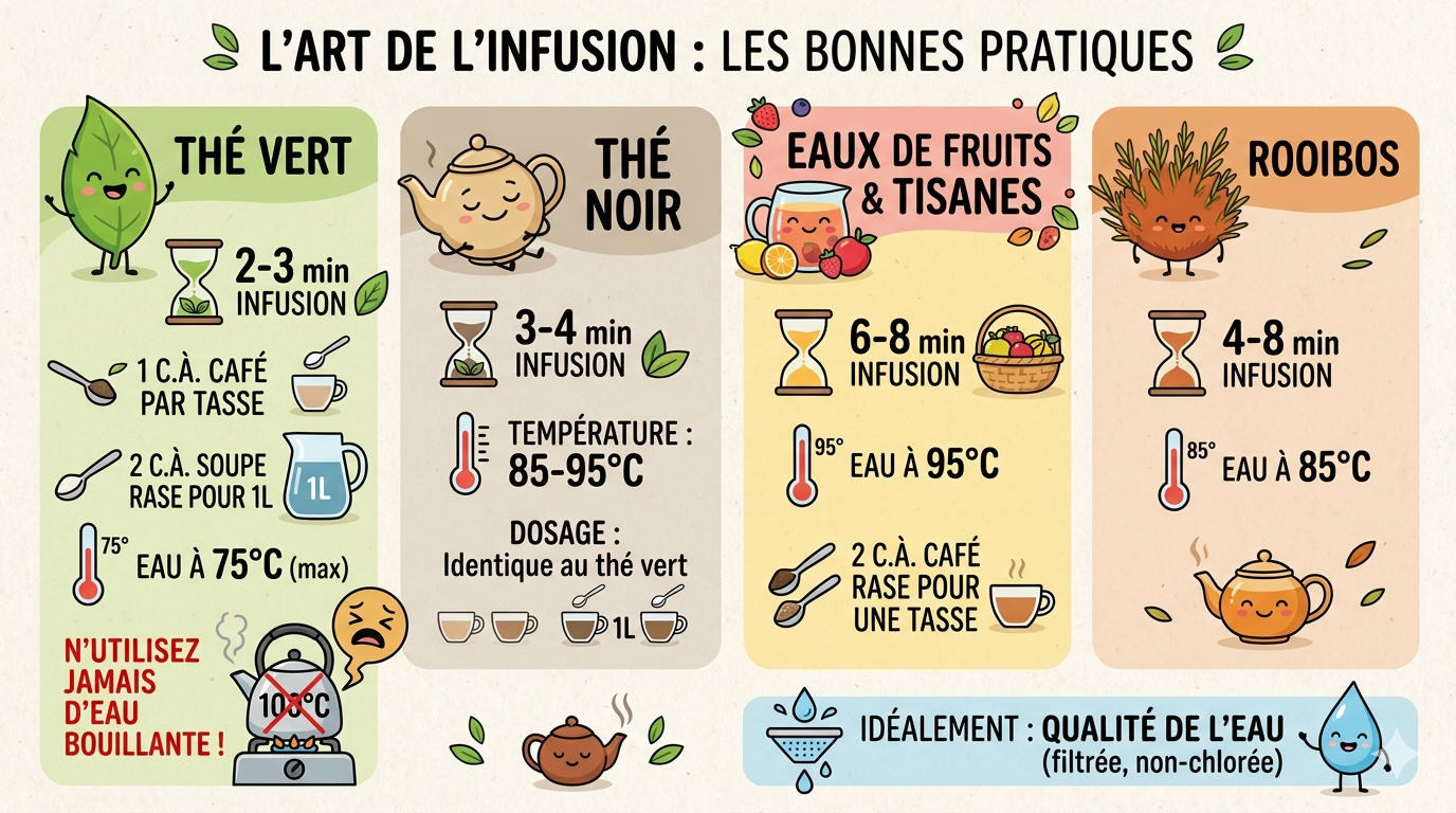 Utilisez une théière adaptée ou une tasse avec infuseur, et privilégiez les feuilles entières pour une meilleure libération des arômes.