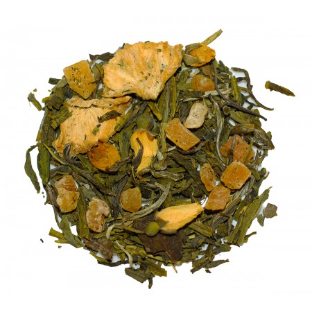 Ingrédients : Thé vert Sencha, thé blanc Pai Mu Tan, pétales de rose jaune, morceaux de mangue (3%), flocon d’ananas (3%), arômes de poire-passion.