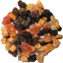 Ingrédients: Raisins secs, morceaux de pêche (25%), morceaux de papaye, morceaux de mangues, morceaux d'ananas, morceaux de pomme, morceaux de framboises (5%), arôme naturel de pêche de vigne, arôme naturel de framboise.