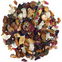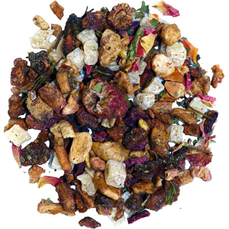 Ingrédients: Morceaux d´ananas (ananas, sucre), morceaux de pomme, morceaux de pommes acidifiés (pomme, agent acidifiant: acide citrique), betterave rouge, arôme, grains de grenade (6%), feuilles de menthe poivrée entières (5%), pétales de rose, framboises entières, menthe (3%), flocons de carotte.