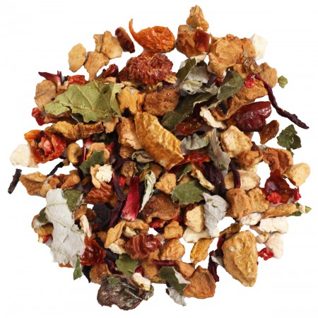 Ingrédients: 57,5% Pomme*, 10% Cynorrhodon*, 10% Hibiscus*, 0,5% zeste de citron*, 2% feuille de framboisier*, 10% écorces d’orange*, 3% fraise*, 2% Arome naturel de citron, 5% Arome naturel de fraise*.