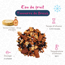 Ingrédients : Raisin de Corinthe, morceaux de pomme, brisures de fèves de cacao, rouleaux de cannelle, morceaux de croquant (sucre, noisette, sirop de sucre de caramel), arôme naturel de sirop d’érable, morceaux de pêches, morceaux de vanille.