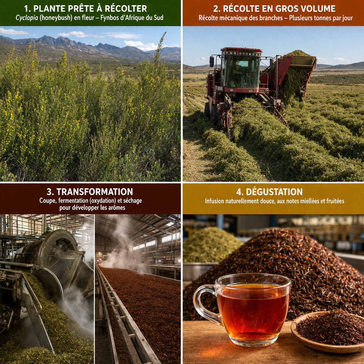 - Nom botanique : Cyclopia spp. (principalement C. intermedia, C. subternata)