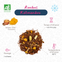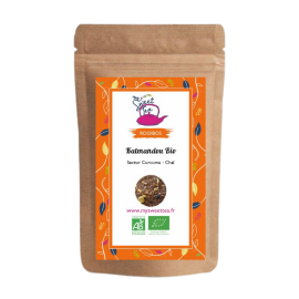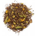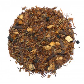 Ingrédients : Rooibos Supergrade*, curcuma*, cannelle*, réglisse*, gingembre*, poivre*, fenouil*, cardamome*, pomme,* écorces de cacao*, clous de girofle*. Sans théine, peut être bu chaud comme froid.