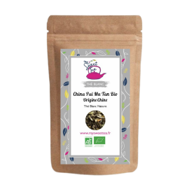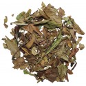 Thé blanc avec une feuille verte – marron et beaucoup de pointes blanches.