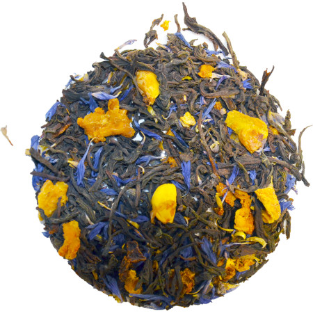 Ingrédients: Thé noir de Ceylan (70%), écorces d'orange (15%), arômes naturels de (bergamote, de vanille, de crème, de fleur d'oranger), pétales de bleuet, lavande.