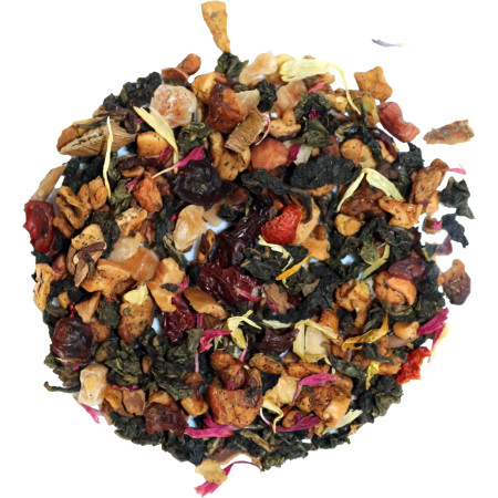 Ingrédients: Morceaux de pomme, thé Oolong (27%), écorces d'églantier, fragment de papayes (papayes, sucre, acidulant: acide citrique), morceaux de cannelle, arôme crème brûlée, morceaux de vanille (2%), pétales de bleuet rouges, fleurs de souci.