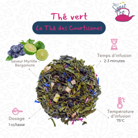 Le Thé des Courtisanes vous invite à découvrir une expérience sensorielle unique, où la finesse du thé vert se mêle à la douceur des myrtilles et à la gourmandise de l'Amaretti.
