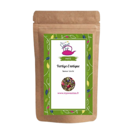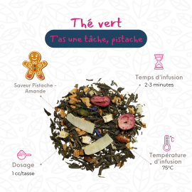 Ingrédients : Thé vert (54%), morceaux de pomme, chips de noix de coco, pistaches (5%), arôme, pétales de bleuet blancs, canneberges émincées.