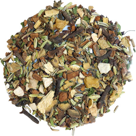 Ingrédients : Bâtons de cannelle*, fenouil*, gingembre* (4%), écorces d’orange* (2%), anis*, racine de réglisse* (2%), écorces de cacao* (1%), clous de girofle*, tulsi*, dent-de-lion*, ananas*.