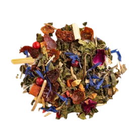 Ingrédients : Morceaux de pomme*, citronnelle*, honeybush*, feuilles de mûriers*, betterave*, verveine citronnée*, écorces d'oranges*, arôme naturel de mangue, arôme naturel de baies, arôme naturel de fraise, huile essentielle de bergamote*, fleurs de souci*.